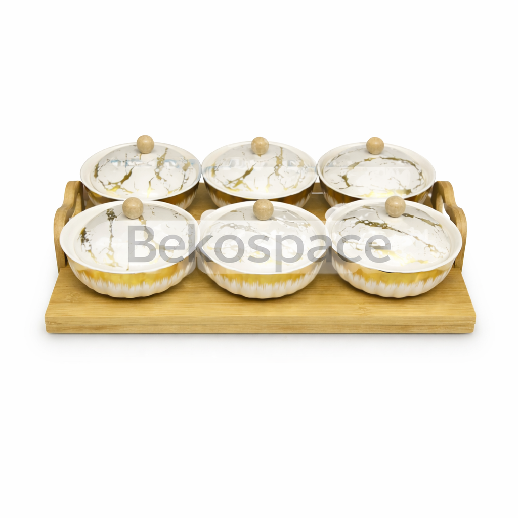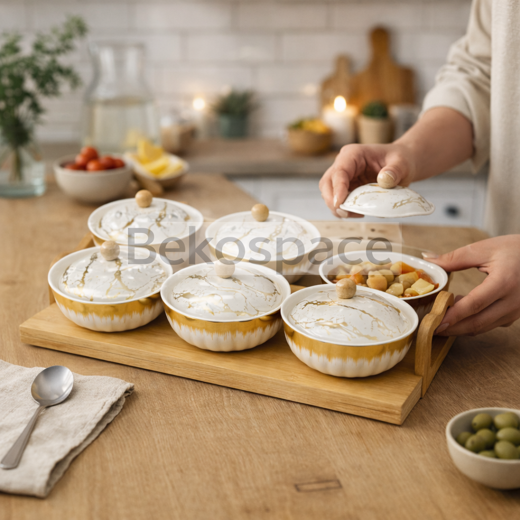 Transformez vos moments de réception en une expérience luxueuse avec ce set de service raffiné de chez Bekospace. Conçu pour allier l'esthétique du marbre à la chaleur du bois naturel, cet ensemble est parfait pour présenter vos dattes, fruits secs, noix ou douceurs orientales.