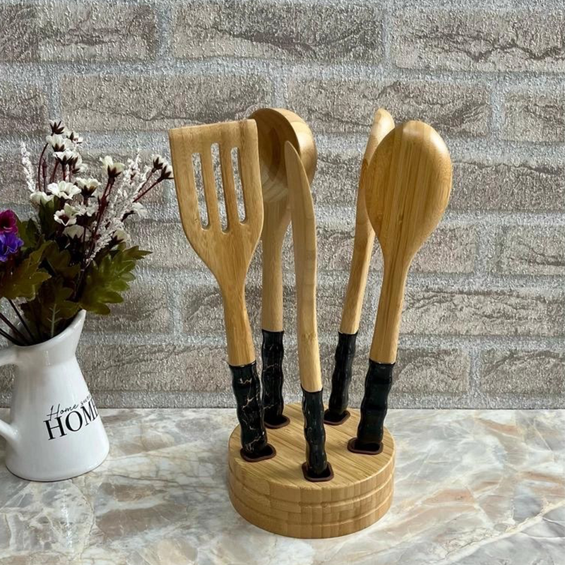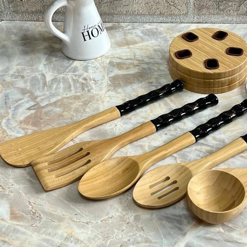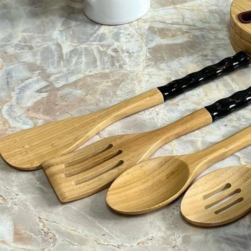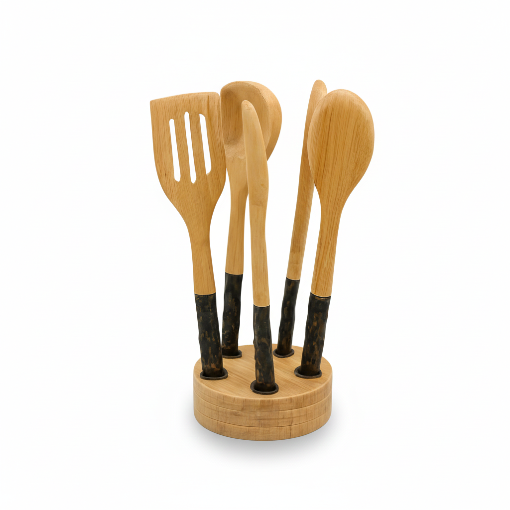 Cuisinez en toute sérénité avec ce set d’ustensiles en bambou résistant à la chaleur et aux manches en bois de hêtre. L’essentiel du minimalisme, sans compromis.