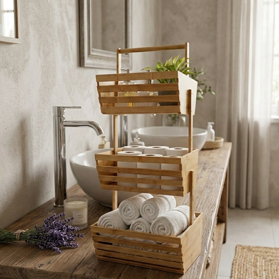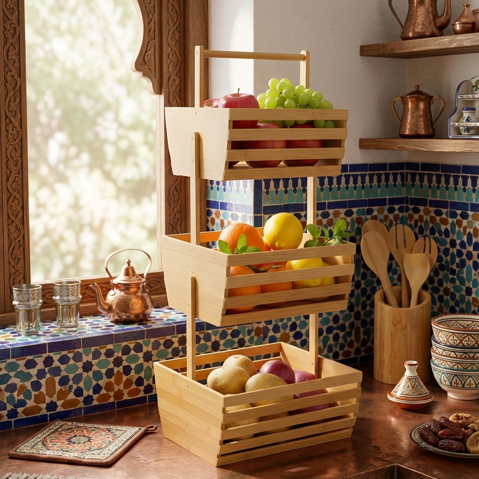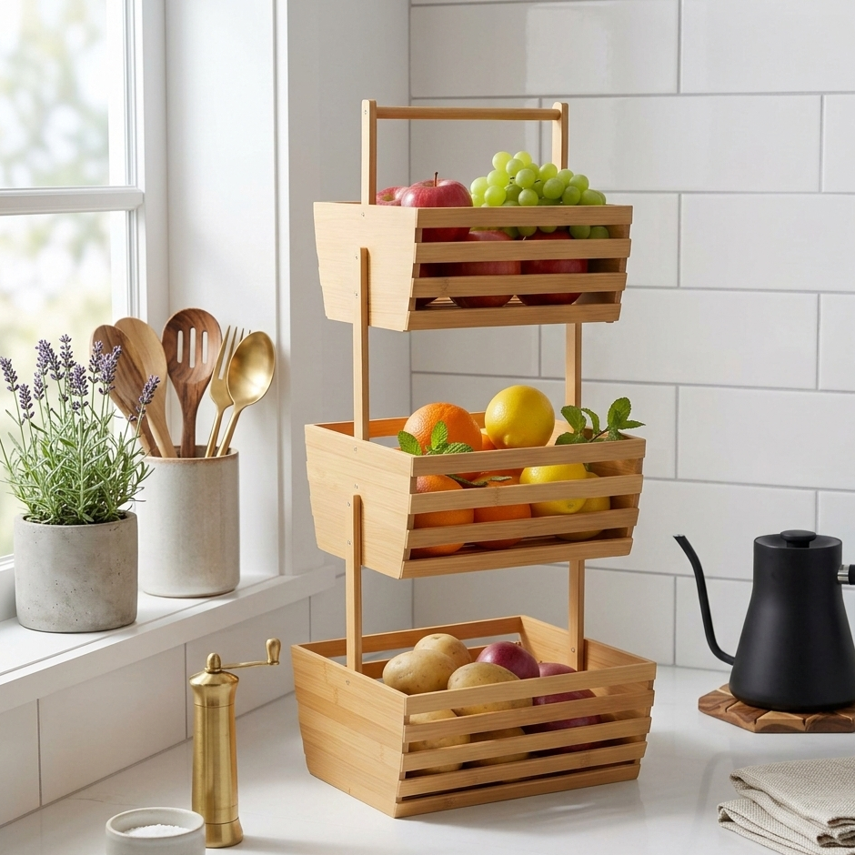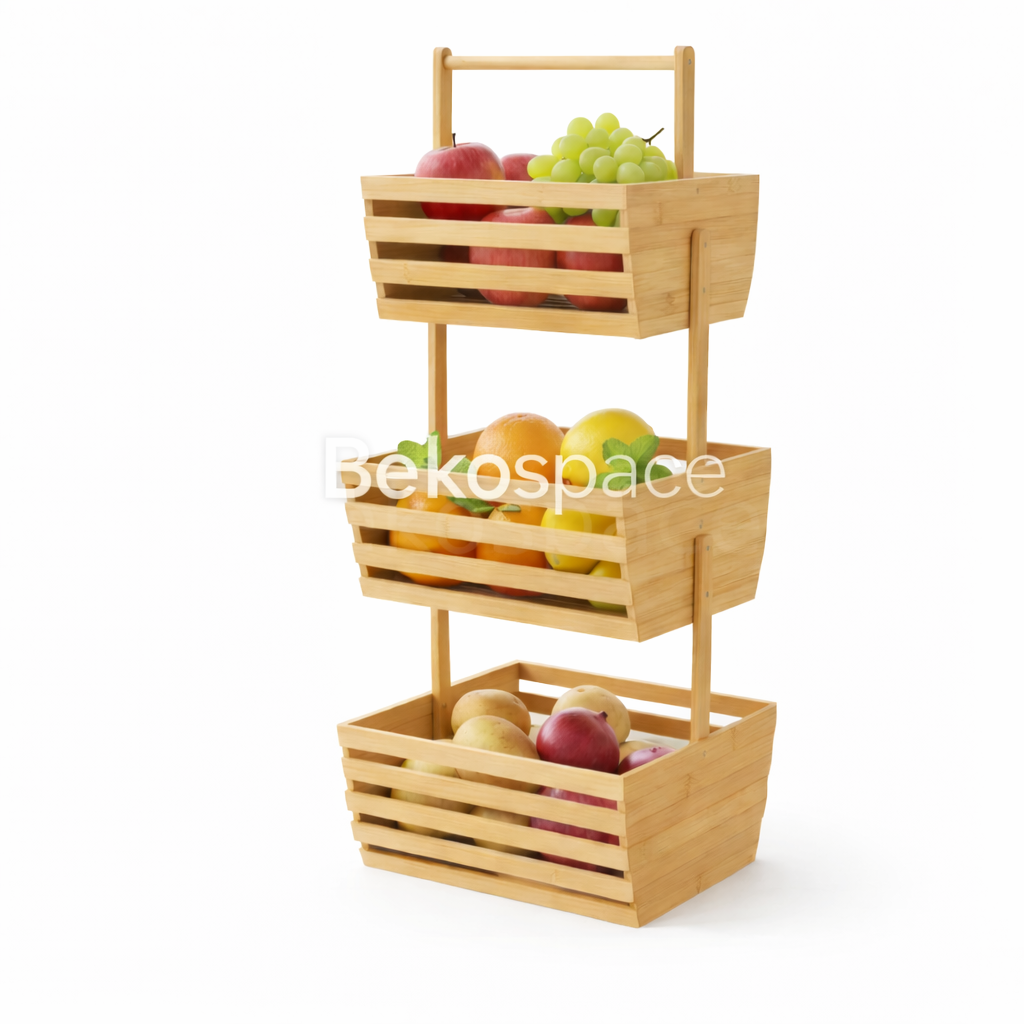 Organisez votre maison grâce à ce support 3 niveaux en bambou naturel. À la fois élégant, solide et polyvalent, il vous permet de garder vos aliments et accessoires bien rangés tout en apportant une touche naturelle et chaleureuse à votre espace.