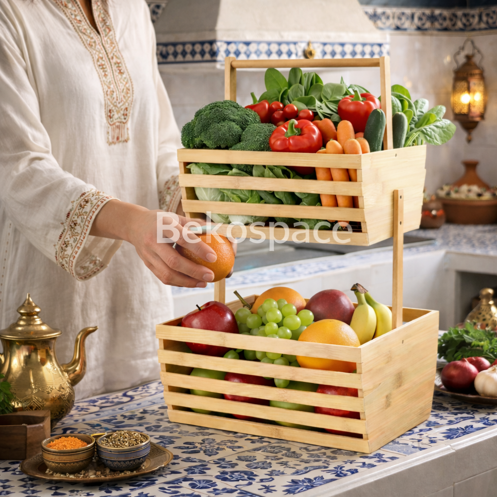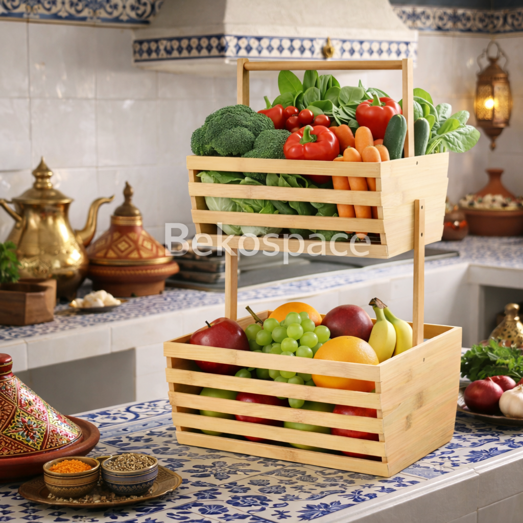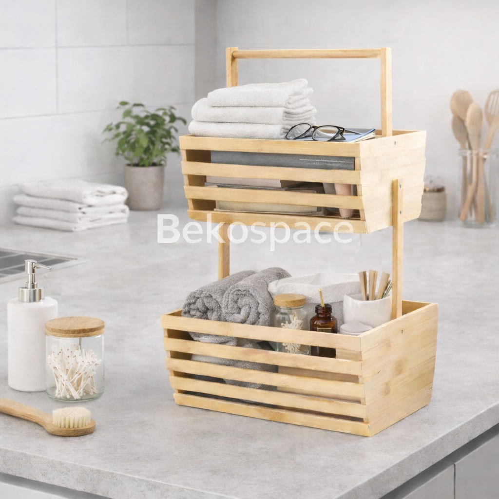 Organisez votre maison grâce à ce support 2 niveaux en bambou naturel. À la fois élégant, solide et polyvalent, il vous permet de garder vos aliments et accessoires bien rangés tout en apportant une touche naturelle et chaleureuse à votre espace.