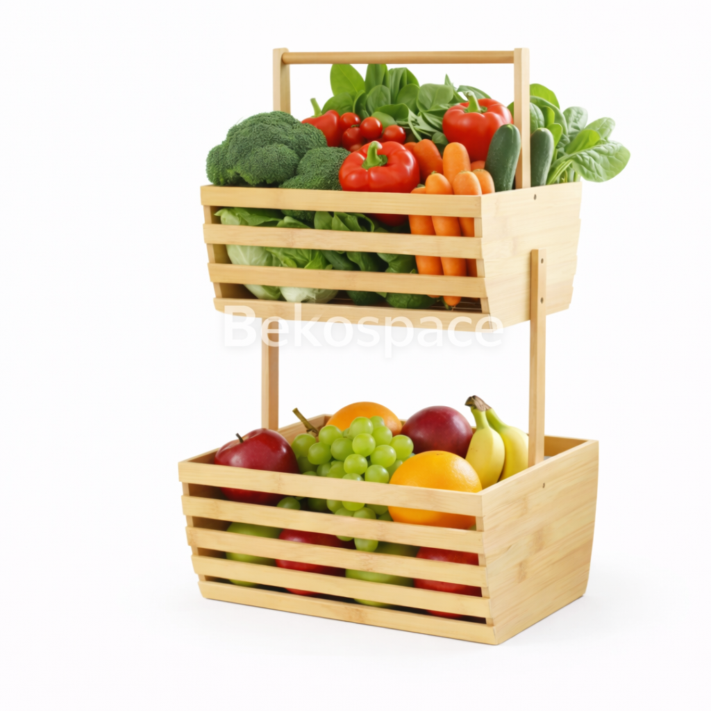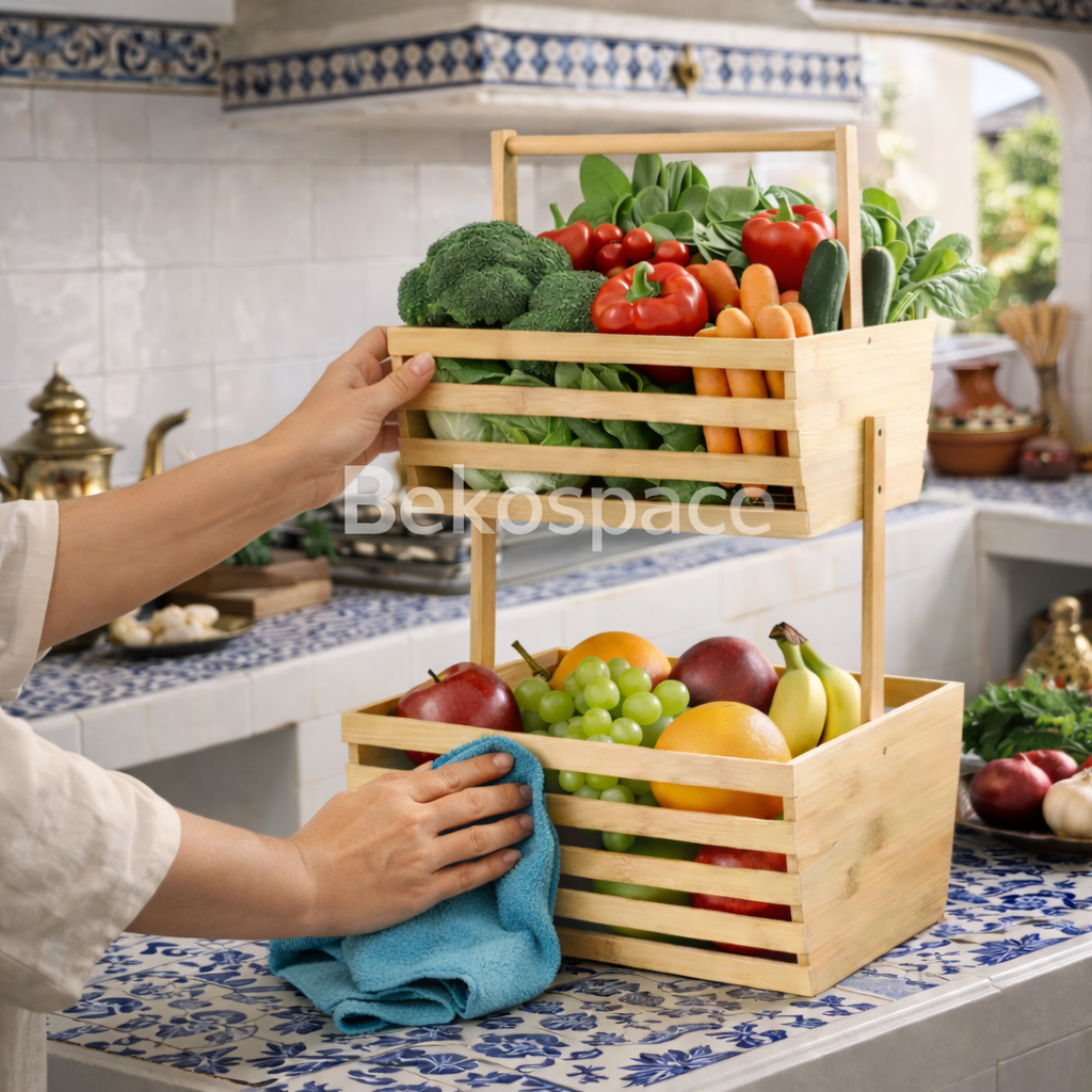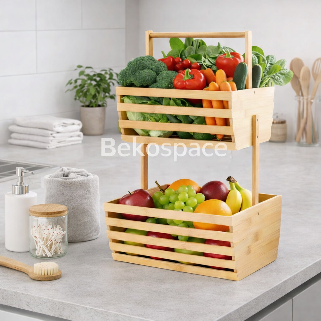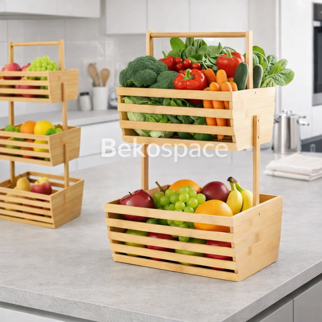 Organisez votre maison grâce à ce support 2 niveaux en bambou naturel. À la fois élégant, solide et polyvalent, il vous permet de garder vos aliments et accessoires bien rangés tout en apportant une touche naturelle et chaleureuse à votre espace.