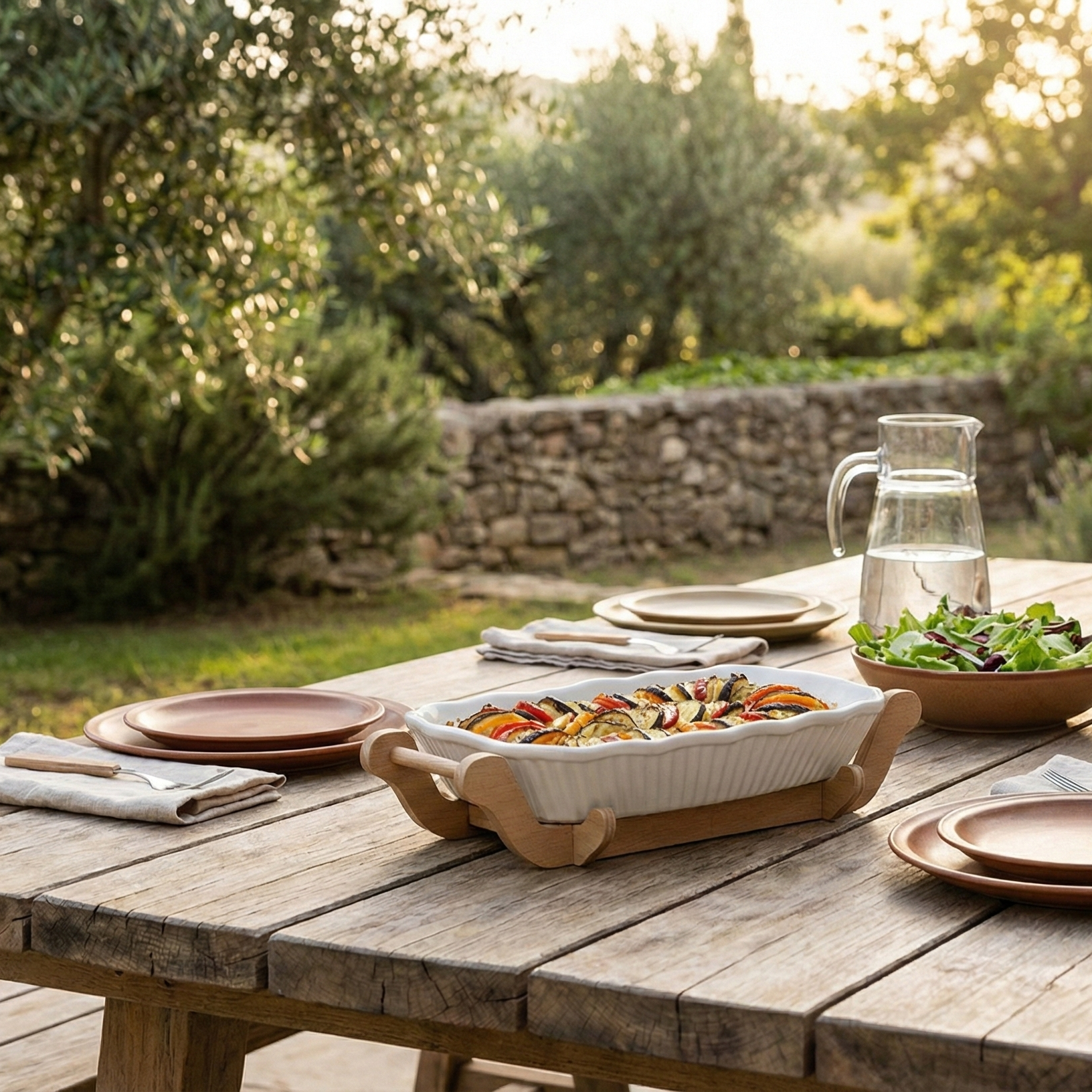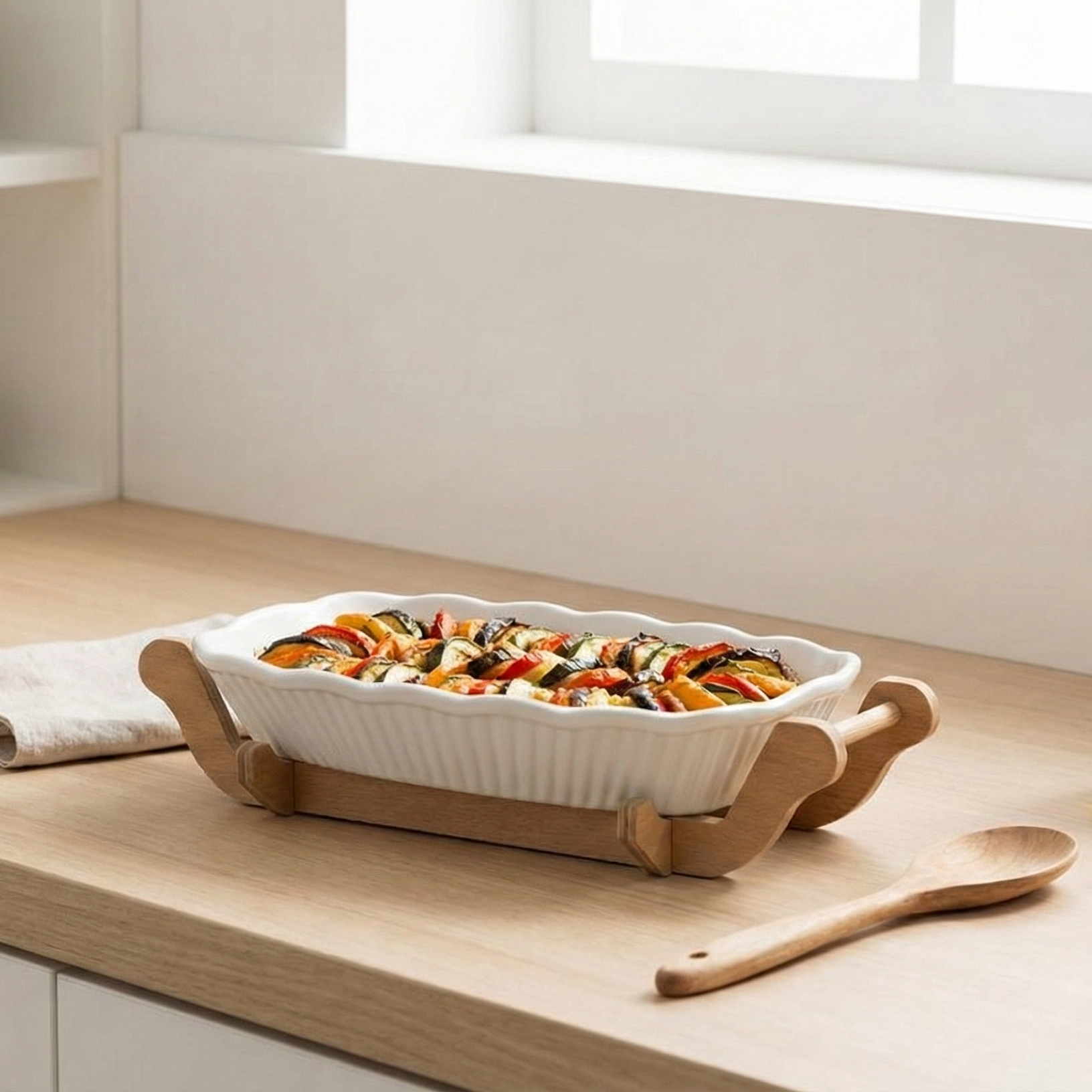 ✅ Élégance Naturelle : Le mariage du plat blanc et du support en bois offre une présentation chic, directement du four à la table.