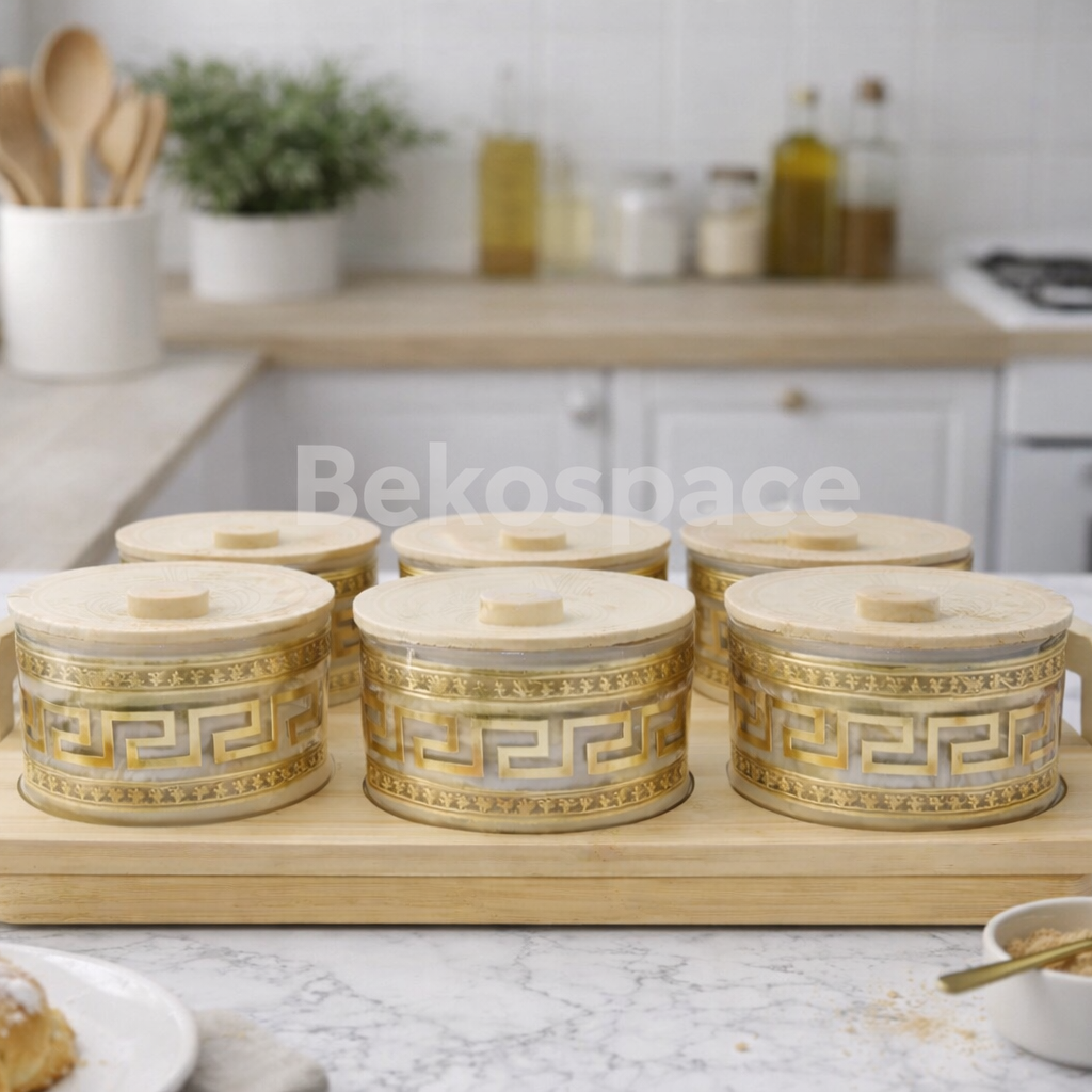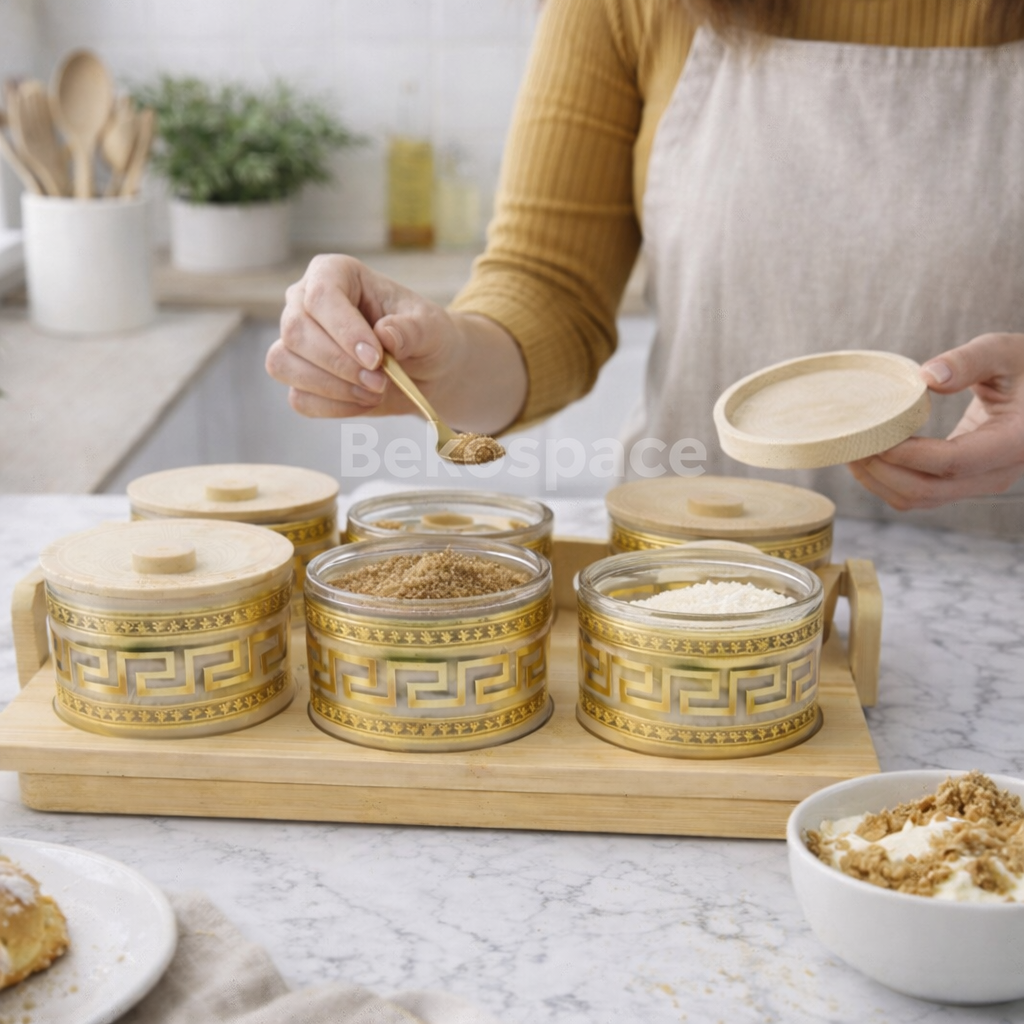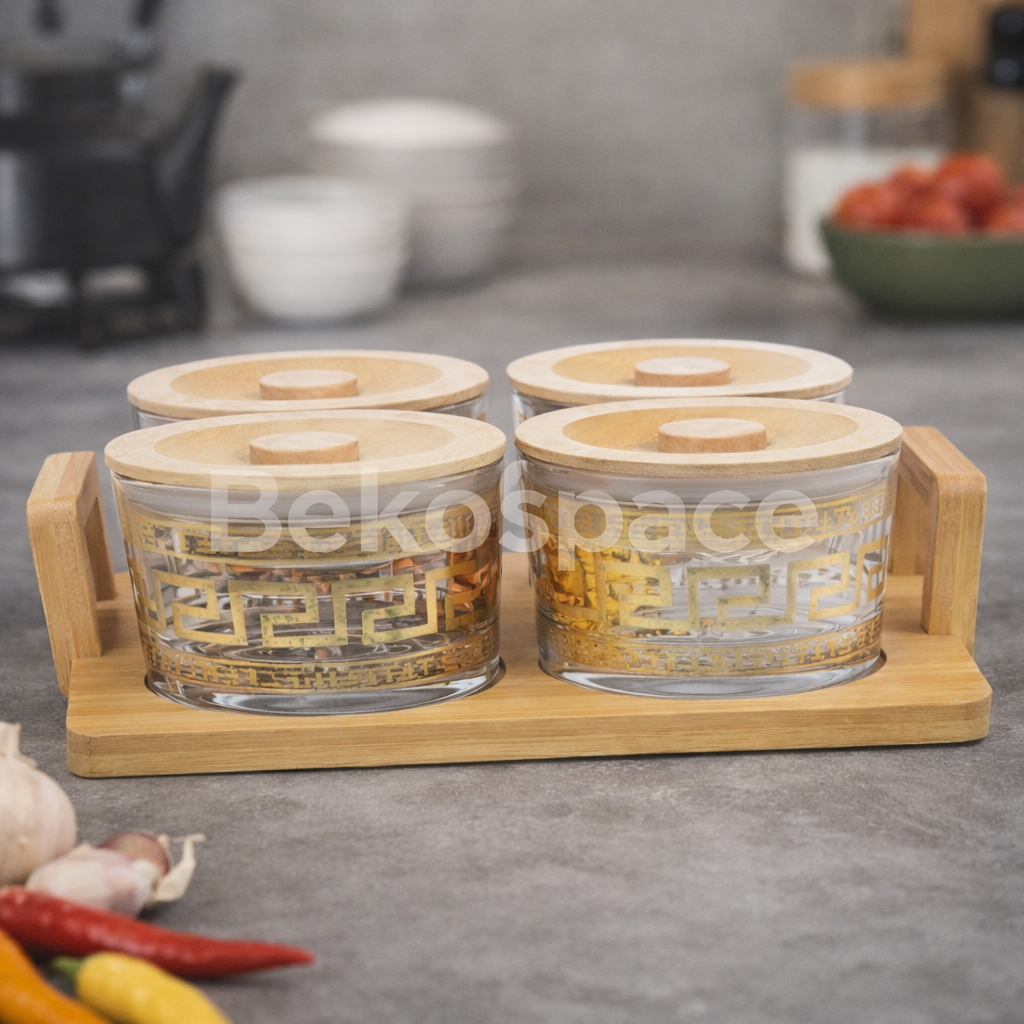 Imaginez votre plan de travail, autrefois encombré, désormais paré de ce magnifique plateau en bois. À l'intérieur des pots en verre aux reflets dorés, vos épices colorées, vos grains de café ou vos thés préférés deviennent des éléments de décoration à part entière.